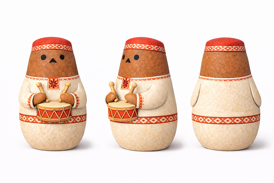 Все объекты объединены общей формой, масштабной логикой (по принципу матрёшки), материалом и способом производства, но различаются деталями рельефа, орнамента и инструментов, что позволяет сохранять индивидуальность каждого персонажа внутри серии.