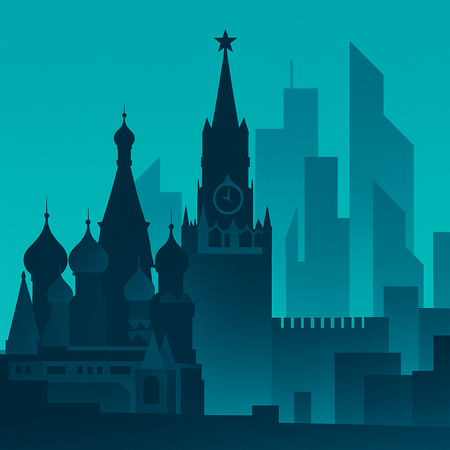 create an image of Moscow using this design: minimalist geometric vector illustration with a limited color palette of deep blue, teal, and turquoise. flat design with sharp, clean shapes and clear contrast between light and dark areas. no gradients or textures. simple architectural or structural silhouettes with layered depth and sense of perspective. calm and slightly moody atmosphere. inspired by modern digital minimalism and abstract cityscapes.