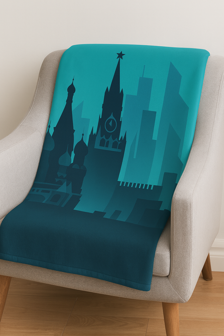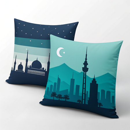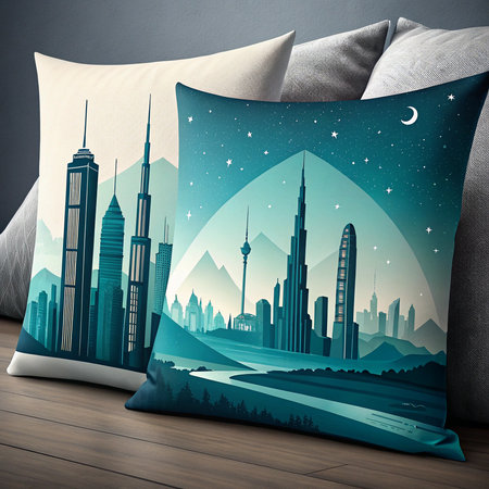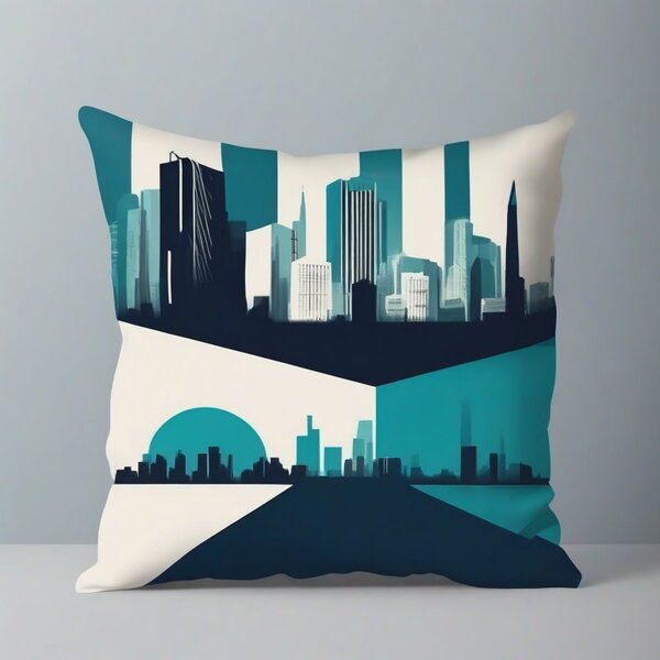 Промт создания: photorealistic image pillows with print of city in a minimalist geometric vector illustration with a limited color palette of deep blue, teal, and turquoise. flat design with sharp, clean shapes and clear contrast between light and dark areas. no gradients or textures. simple architectural or structural silhouettes with layered depth and sense of perspective. calm and slightly moody atmosphere. inspired by modern digital minimalism and abstract cityscapes.