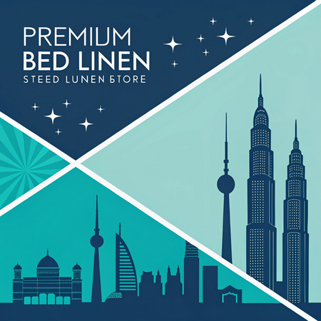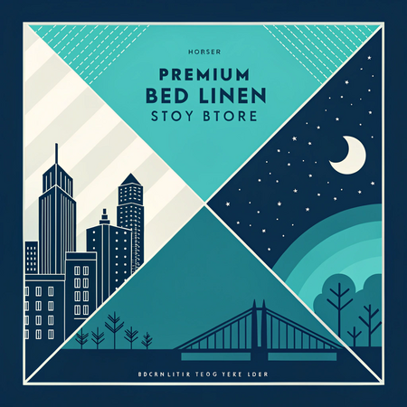 Промт: poster for a premium bed linen store in a minimalist geometric vector illustration with a limited color palette of deep blue, teal, and turquoise. flat design with sharp, clean shapes and clear contrast between light and dark areas. no gradients or textures. simple architectural or structural silhouettes with layered depth and sense of perspective. calm and slightly moody atmosphere. inspired by modern digital minimalism and abstract cityscapes.