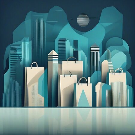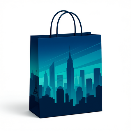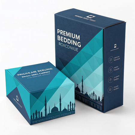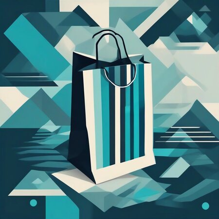 Промт: paper bag for premium bedding in a minimalist geometric vector illustration with a limited color palette of deep blue, teal, and turquoise. flat design with sharp, clean shapes and clear contrast between light and dark areas. no gradients or textures. simple architectural or structural silhouettes with layered depth and sense of perspective. calm and slightly moody atmosphere. inspired by modern digital minimalism and abstract cityscapes.