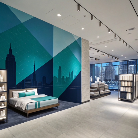 Промт 2: A photorealistic retail space for a premium bedding store, designed in a minimalist geometric vector illustration style with a limited color palette of deep blue, teal, and turquoise. Flat design with sharp, clean shapes and clear contrast between light and dark areas. No gradients or textures. Simple architectural or structural silhouettes with layered depth and a sense of perspective. Calm and slightly moody atmosphere. Inspired by modern digital minimalism and abstract cityscapes.