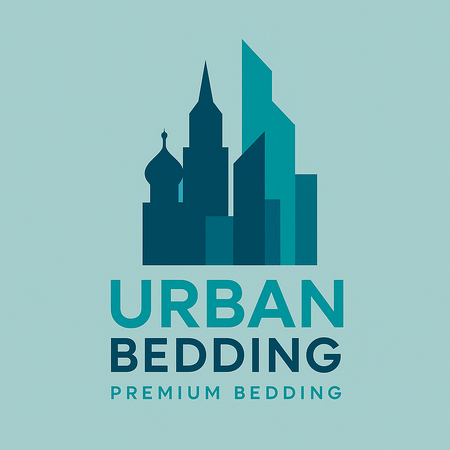 Create a logo for a premium bedding store. The main visual theme of the products is cities. This style is minimalist geometric vector illustration with a limited color palette of deep blue, teal, and turquoise. Flat design with sharp, clean shapes and clear contrast between light and dark areas. No gradients or textures. Simple architectural or structural silhouettes with layered depth and a sense of perspective. A calm and slightly moody atmosphere. Inspired by modern digital minimalism and abstract cityscapes.
