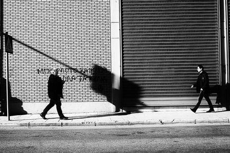 Петрос Котзабасис, работы без названия, Греция, 2011. Человеческие тени создают дополнительные смыслы к уже существующему сюжету.