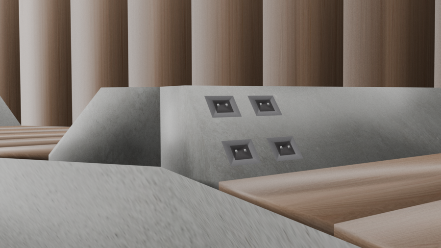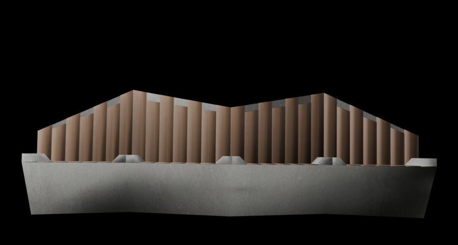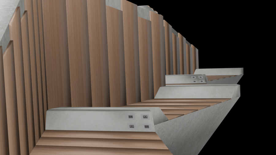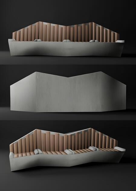 Скамейка представляет собой крупную, цельную городскую мебель, рассчитанную на большую открытую территорию и потоки людей. Корпус выполнен из монолитного бетона, а посадочные и вертикальные элементы — из тёплого дерева, за счёт чего строгий силуэт смягчается и становится визуально комфортным.