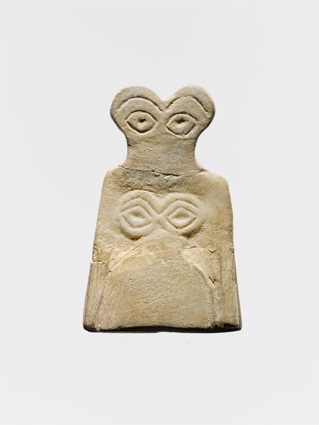 1. Идол-глаз, Средний Урук, ок. 3700–3500 гг. до н. э. 2. Статуэтка из Хаджилара (5250-5000 гг. до н. э.)