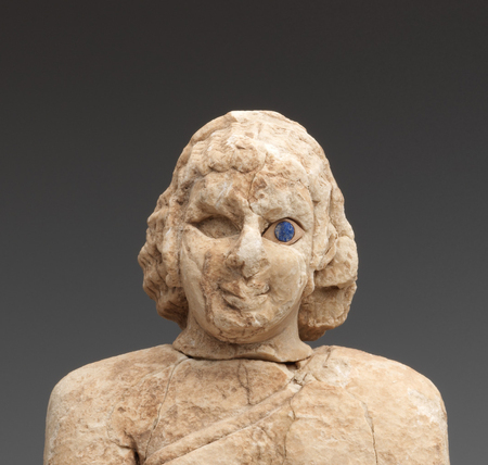 Автор статуэток выделил глаза не только за счет их размера, но и цвета. Белок и зрачок глаз выполнены из других материалов, выделяющихся на фоне остальной фигуры из алебастра или известняка.