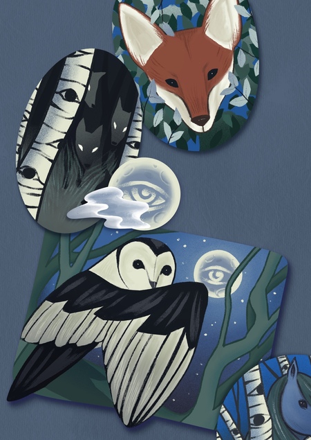 Серия стикеров показывает лес как живой организм, где взгляд ощущается в луне, берёзах и животных, а тишина и таинственность создают ощущение единой, наблюдающей структуры.