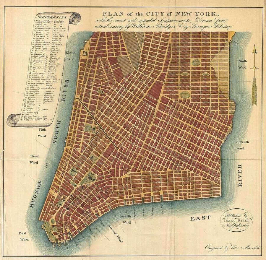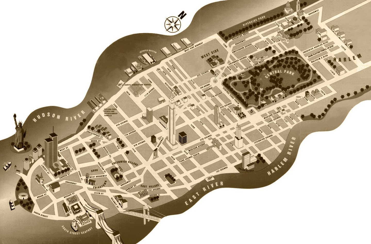 более детальная карта Манхэттена позволяет увидеть, насколько сетчатая планировка эффективно разделяет городскую среду на зоны: жилые кварталы, парки и скверы, культурные достояния города, портовые сооружения и государственные здания