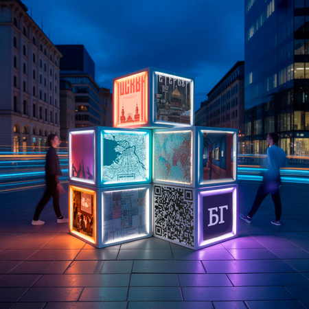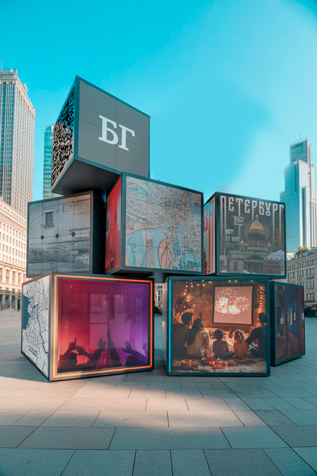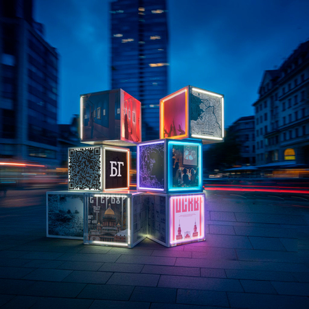 Концепция инсталляции «Большой Город» (BG.RU) Идея: создать мобильную инсталляцию в виде модульных кубов, символизирующих многогранность городской жизни и ценности медиа BG.RU. Кубы можно компоновать в разные конфигурации это подчеркнёт динамичность и адаптивность бренда.