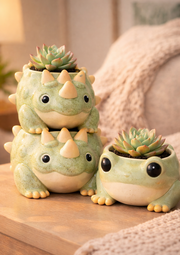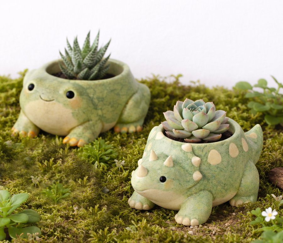 Наименование: Серия цветочных горшков «guardians». Количество позиций: 5 уникальных дизайнов (улитка, ежик, лягушка, черепаха, динозавр). Целевое использование: декоративные горшки для суккулентов, комнатных растений и мини-садиков, подарки, коллекционные предметы для интерьера.