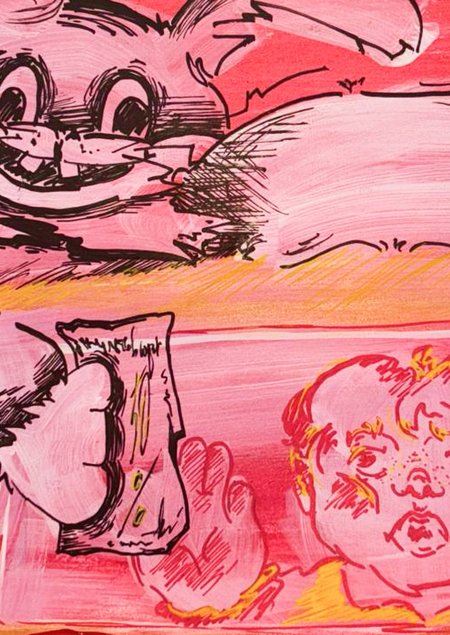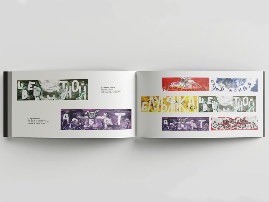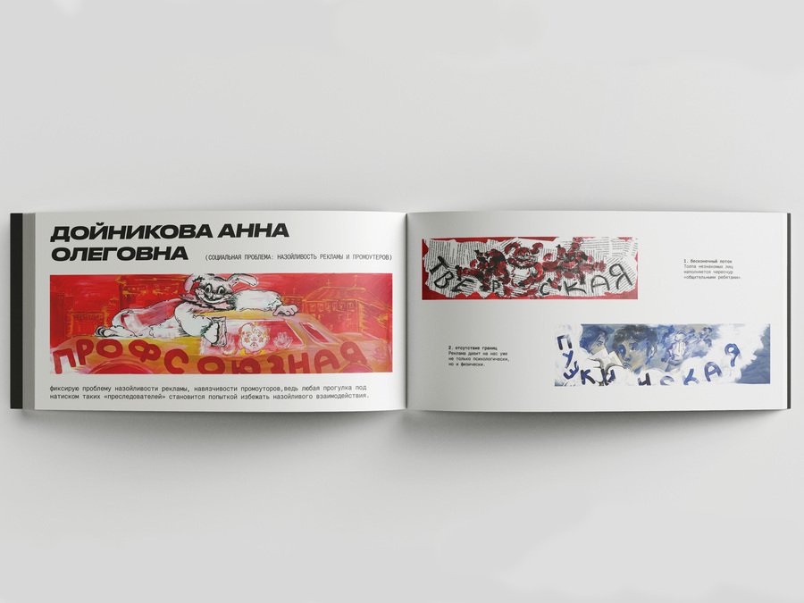 Моя работа раскрывает проблему назойливости рекламы, навязчивости промоуторов — изображение их образов в ростовых костюмах помогает передать дискомфорт от одного лишь вида вездесущего «преследователя».