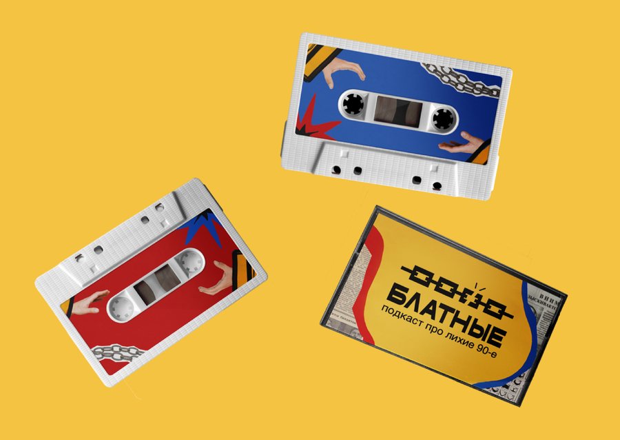 Top view, a bunch of cassettes with a podcast about the wild 90s are lying on the table. The cassettes are in blue, yellow, and red, in the style of the podcast.