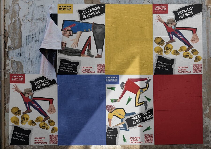 Промт для мокапа плакатов в Sora: A realistic street scene in a modern city with three vintage-style posters displayed side by side on a wall or billboard. The posters have a retro Soviet 1990s design aesthetic — bold typography, muted colors, and slightly aged paper texture. The scene is photographed at golden hour, with soft shadows, a slightly warm tone, and realistic lighting. Surroundings include an urban sidewalk, a brick or concrete wall, and some subtle street details like a trash bin, graffiti, or old posters around. Style: photorealistic mockup, high resolution, natural perspective, street photography aesthetic, 3:2 ratio.