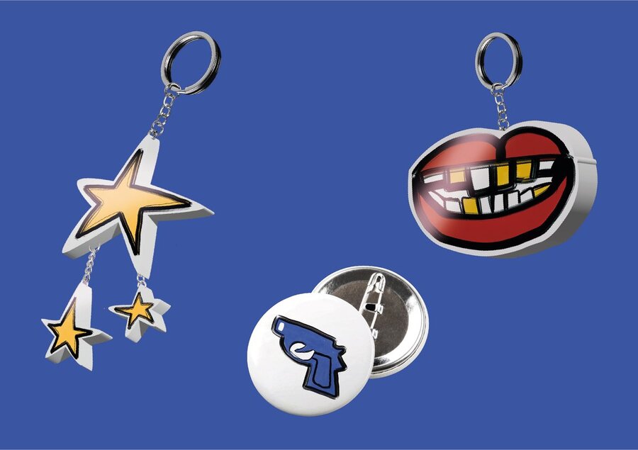 «No Signal» is a square icon with a TV noise and a white-pixelized message. The pager is a retro keychain. The mini-cassett is a transparent keychain shaped like an audio cassette.