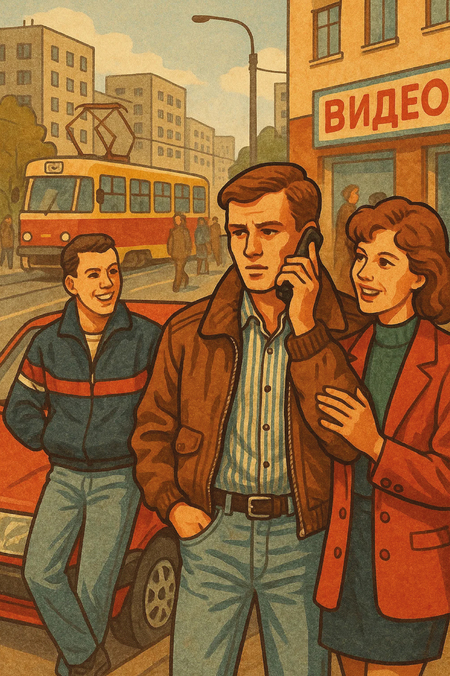Промт в Sora: 1. Generate a drawing of A nostalgic Soviet street scene from the early 1990s, showing teenagers with a large cassette boombox, an old «Ikarus» bus passing by, a small kiosk selling chewing gum and VHS tapes, signs like «Видеосалон», cracked asphalt and panel houses in the background. Warm sunset light, slight film grain, retro color palette of faded reds and blues. At the bottom there is a text: «Слушай истории, где всё только начиналось». The style of a poster should match the logo.
