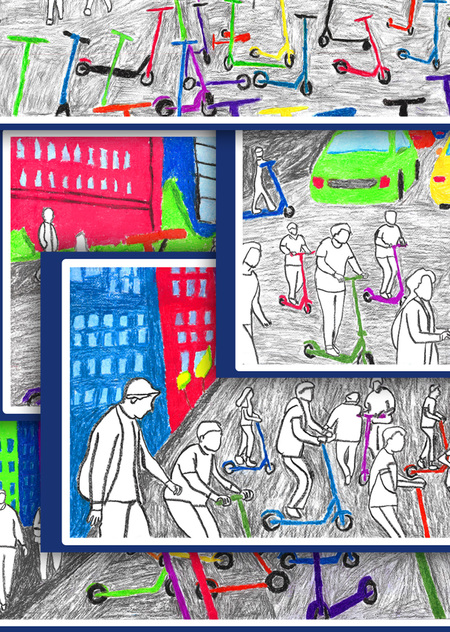«Самокаты» — это символ мобильности мегаполиса и одновременно отражение острой социальной проблемы Москвы. В этой работе я показываю динамику движения и замороженные моменты, подчёркивая конфликт между человеком, транспортом и городской средой. На фоне зданий и улиц. Самокаты становятся знаком хаотичности, напряжения и противоречий современного города.
