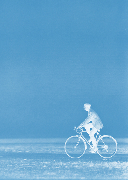 //промт: A minimalistic, high-contrast silhouette of a man riding a vintage bicycle on a flat, textured surface. The entire scene is rendered in cyanotype style with a blue background and white outlines. The man wears a cap and vintage clothing, positioned on the right side of the frame with plenty of negative space on the left. Soft, subtle texture on the ground and sky for a dreamy, calm atmosphere.