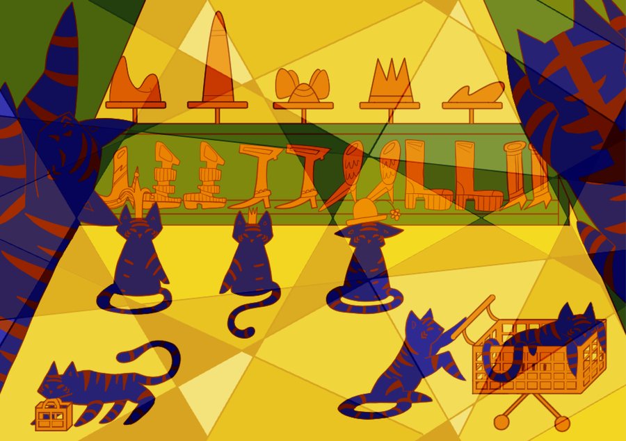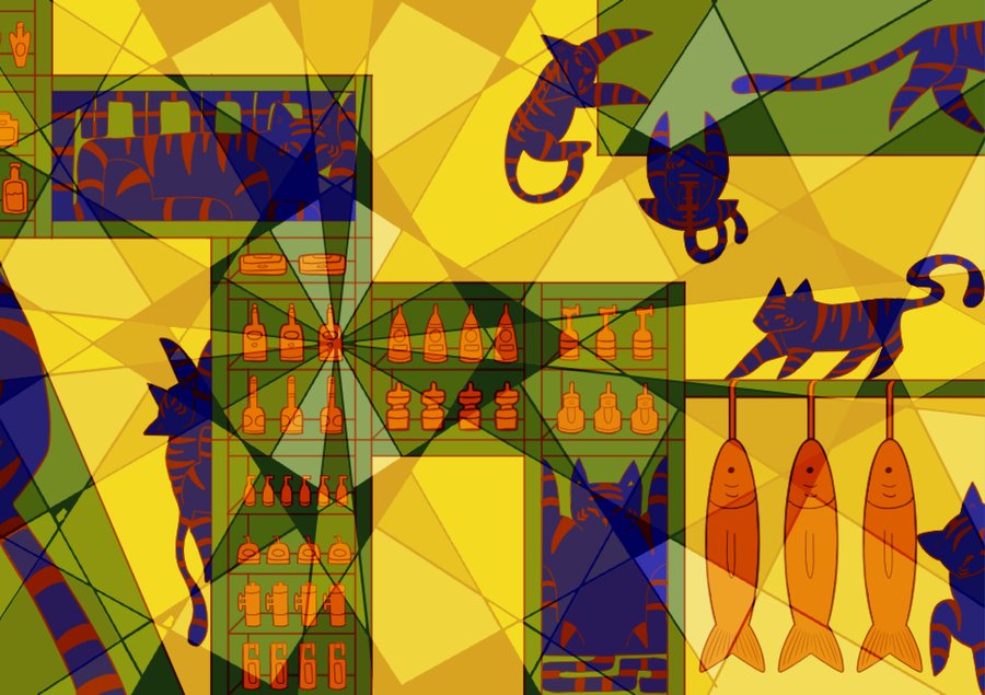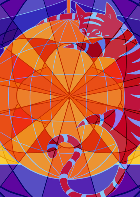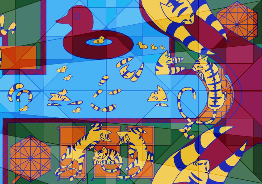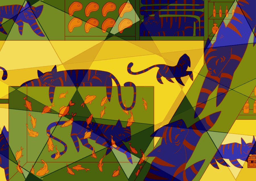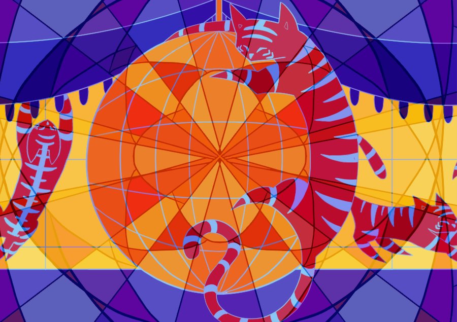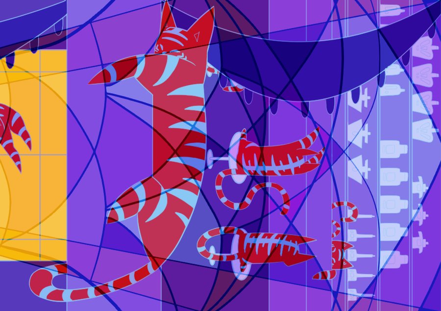 Серия изображений для абажура, объединенных единой темой множества разноцветных тигров в неподходящих для них местах, нарушением пространственного закона и витражными элементами.