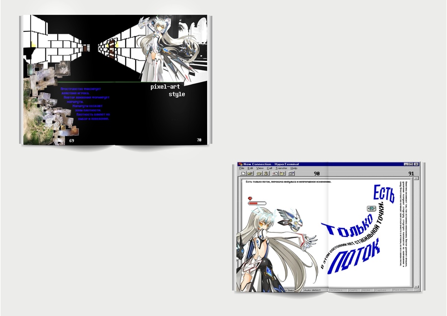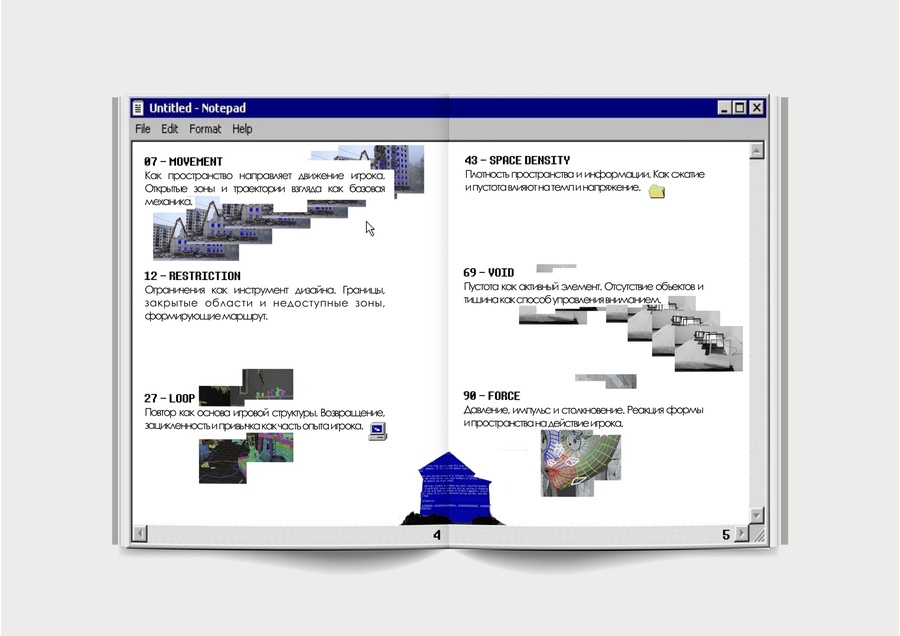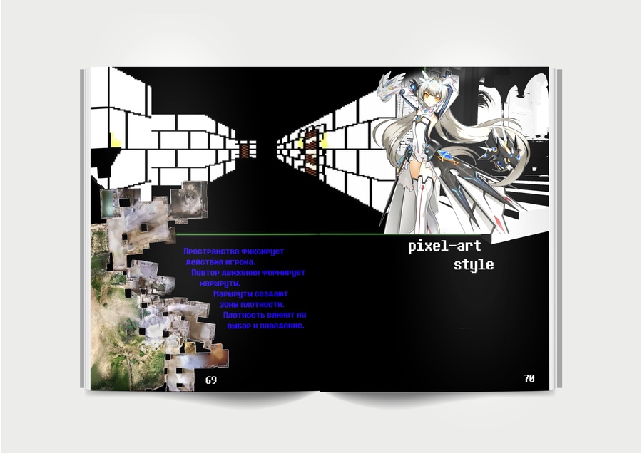 Исследование игровых механик через пространство. Пространство рассматривается как активная система, которая формирует движение, выбор и поведение игрока. Каждый разворот фиксирует отдельный аспект взаимодействия игрока со средой и переводит игровые принципы в визуальный язык.