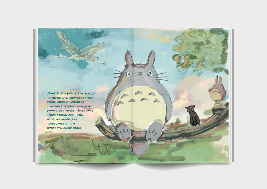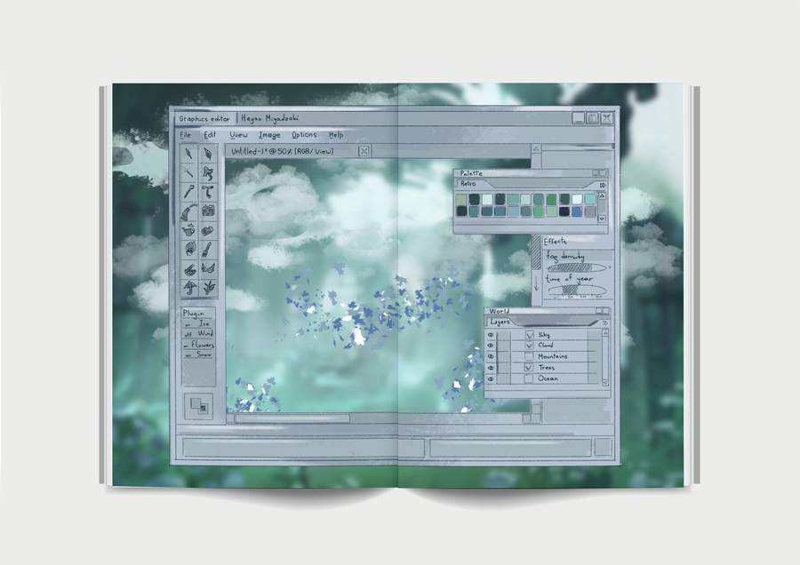 В качестве художника для деконструкции я выбираю Хаяо Миядзаки. Его визуальный язык соединяет природу, механизмы и человека и формирует живые, наполненные движением миры. Я переосмысливаю его художественное мышление в современных реалиях, опираясь на ключевые для него темы хрупкости мира, ответственности и противостояния живого и механического.
