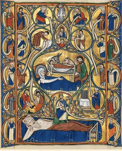 Древо Иессеево. Двенадцать ветхозаветных пророков и Бorородuцa Холкхэмская иллюстрированная Библия. Британская библиотека Англия 1327–1335 гг.