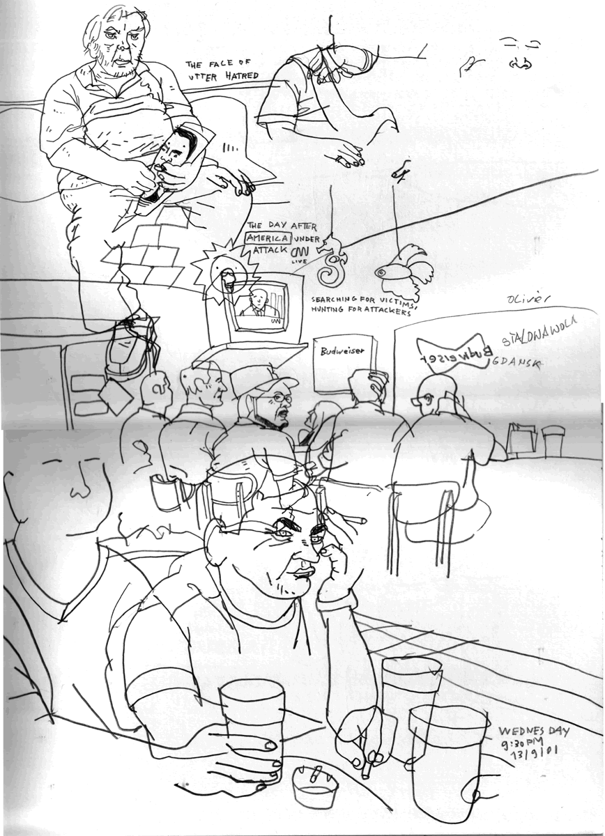 Оливер куглер — известный художник из родом из германии, проживающий в англии, обращавшийся к политической ситуации в странах Ближнего Востока, и на основе личных «экспедиций» составивший ряд репортажных иллюстраций.