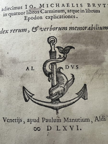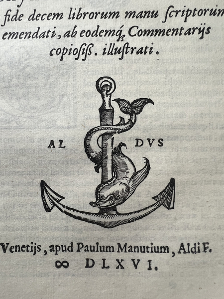 Книги Альда стали подделываться, вследствие чего для издательство была разработана фирменная эмблема с дельфином, обвивающим якорь. Примерно то же время появилось понятие титульного листа, на котором и располагался знак, как это можно видеть и в современных книгах.