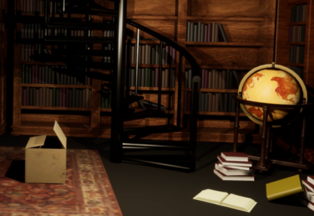 Photorealistic, wide shot of an extremely dark, antique library setting. Features a prominent black cast-iron spiral staircase in the center. The walls are lined with dark wooden bookshelves filled with books. A large, vintage globe on a stand is on the right. An open cardboard box and a stack of books are on a worn, patterned rug. Deep shadows, warm ambient light, horror-quest atmosphere, cinematic lighting.
