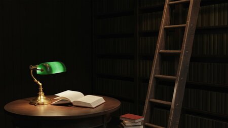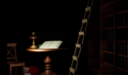A dramatic photorealistic image of a dark room, almost entirely black except for a small, intensely lit circular wooden table in the center. On the table, an open book with blank pages glows under the light of a small, antique desk lamp. To the right, a tall, narrow wooden ladder with thick steps leans against a bookshelf, disappearing into the darkness above. A stack of red books is barely visible at the base of the table. The focus is on the contrast between light and deep shadow, creating a sense of mystery and intimacy.