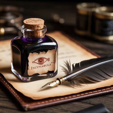 Промт: Detailed photorealistic product shot of an antique writing set. It features a small, corked glass bottle of deep, opaque black ink. The bottle’s label is a worn piece of parchment with the red Incunabula eye logo. Next to it, an old, dark feather quill is stained with the same ink. The set is displayed on a leather writing pad, with subtle dark shadows engulfing the background. Style: Vintage collector’s set, dark academia, macro photography, moody cinematic light.
