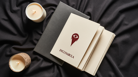 Промт: Photorealistic product mockup, top-down view. The subject rests on a richly textured, matte, monochromatic pitch-black or deep charcoal grey velvet or heavy linen fabric. The background is perfectly uniform and dark, emphasizing the object. Subject: A thick, premium, matte pitch-black or dark grey journal (notebook) is laid slightly open. The journal’s front cover features a small, discreet, debossed version of the minimalist logo in the lower section. The logo is a clean, geometric Deep Red stylized vertical eye symbol placed directly above the word «INCUNABULA» set in a heavy, classic Gothic Revival or Serif typeface. A single, thick, Rough Beige Wax pillar candle with visible melting drips is placed in the corner of the frame. The pages are open to show slightly yellowed, textured Aged Parchment paper. Ultra-realistic product photography, minimalist branding, Dark Academia horror aesthetic, 8K resolution.