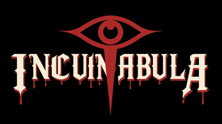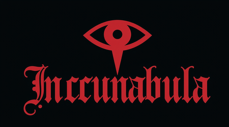 Промт для 2D логотипа: Minimalist, clean vector logo design for «INCUNABULA» on a solid, pitch-black background. The composition features a bold, vertical, geometric Deep Red stylized eye symbol placed directly above the text. Typography: The word «INCUNABULA» is set in a heavy, classic Gothic Revival or vintage Serif typeface. The text is colored Deep Red or Pure White to stand out sharply against the black background. Flat design, vector graphics, high contrast, typography focused, clean lines, corporate identity, 2D rendering, isolated logo.