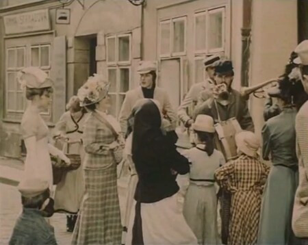Женщина вывела на прогулку дочерей в своих платьях, но только со временем поняла причину косых взглядов мужчин на старшую дочь. «Великолепные мужчины с кинокамерой», Иржи Менцель, 1978