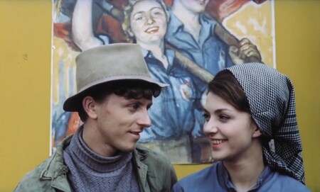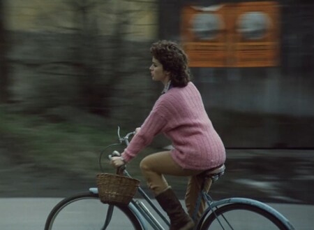 Девушка на велосипеде одна из немногих обладает ярким цветом в одежде, из-за чего она контрастна фону. «Деревенька моя центральная», Иржи Менцель, 1985