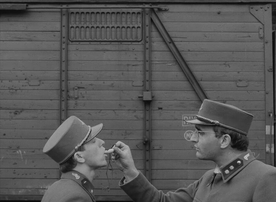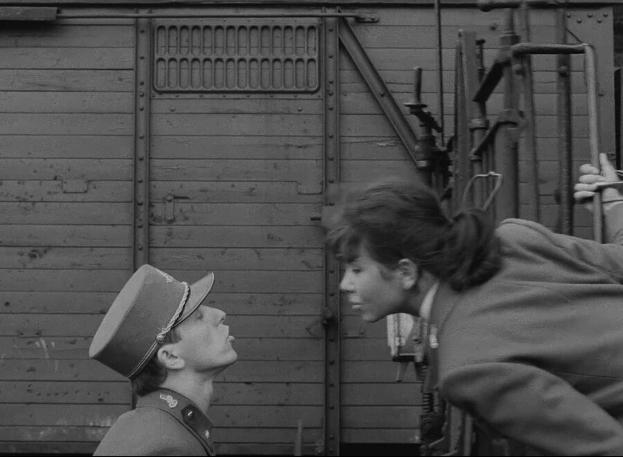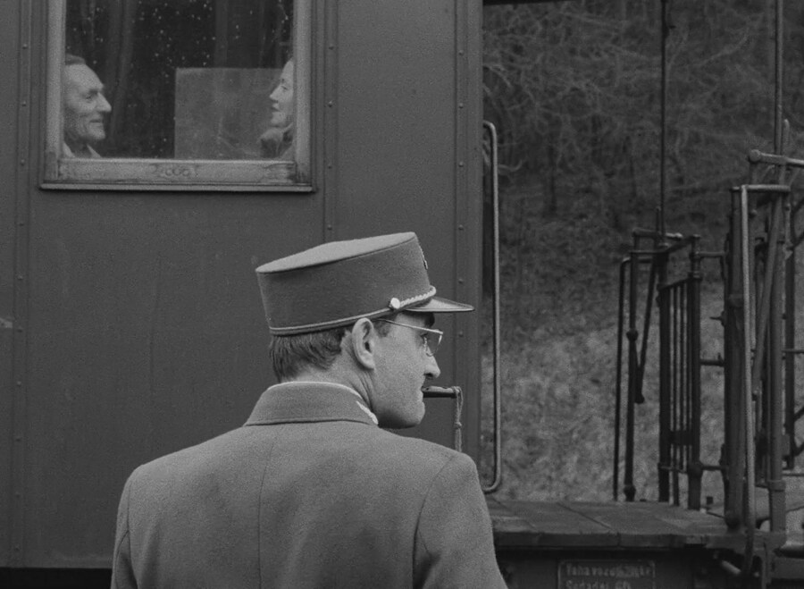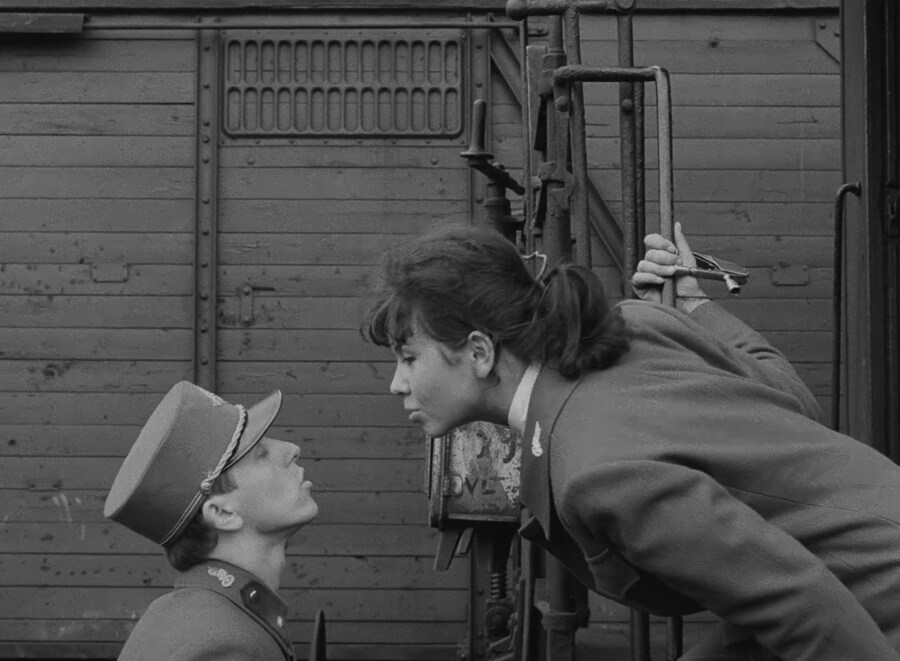 Применение параллельного монтажа, где камера переключается с одного кадра на другой. «Поезда под особым наблюдением», Иржи Менцель, 1966