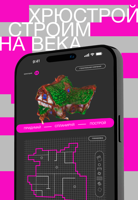 «Хрюстрой» — строительная компания, позволяющая каждому обзавестись прочным домиком, которому не страшны ветра, морозы и злые гости. Интерактивный плакат показывает возможности желающих построить самую недвижимую недвижимость.