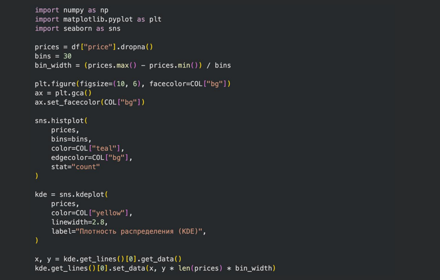 • Непараметрическая оценка плотности (KDE) — применялась для визуального восстановления вероятностного распределения цен. Масштабирование KDE к числу наблюдений позволило корректно сопоставить её с гистограммой частот.