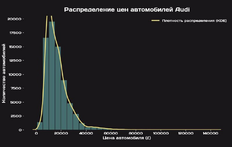 На графике показано распределение цен автомобилей Audi с добавленной линией плотности (KDE). Видно, что основная часть автомобилей находится в среднем ценовом диапазоне, тогда как дорогие модели образуют вытянутый правый хвост распределения.