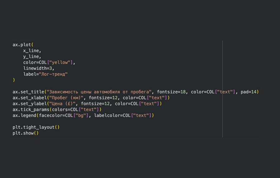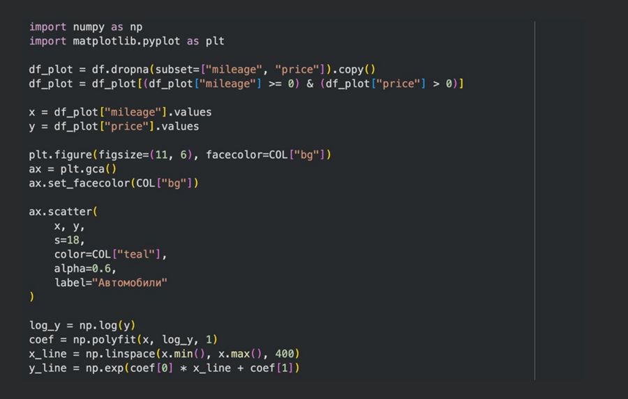 • Регрессионный анализ — использовался для изучения зависимости цены автомобиля от пробега. Применение логарифмической модели позволило выявить нелинейный характер убывания цены при увеличении пробега.