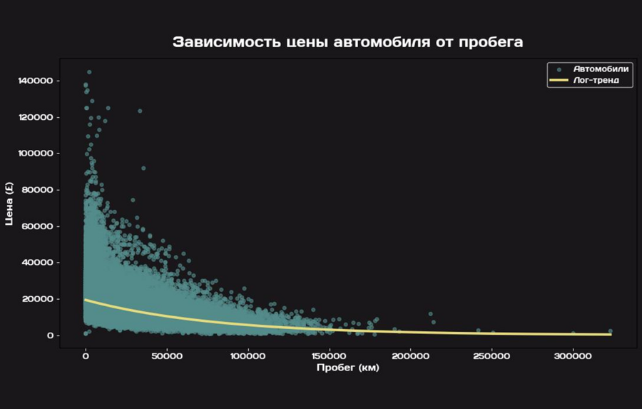 Диаграмма рассеяния иллюстрирует зависимость стоимости автомобиля от пробега. Добавленная логарифмическая линия тренда показывает устойчивую тенденцию снижения цены по мере роста пробега. При этом автомобили с небольшим пробегом демонстрируют более широкий разброс цен, что связано с различиями в моделях и комплектациях.