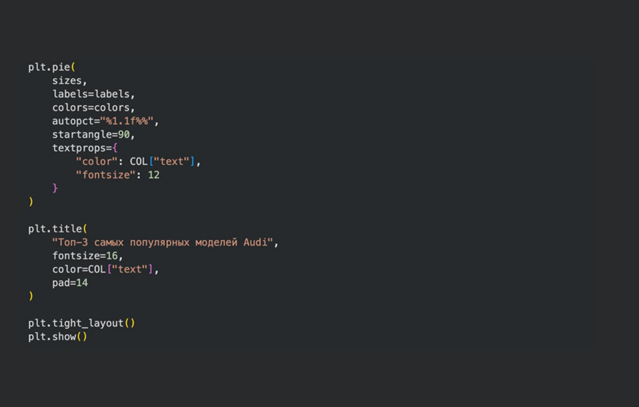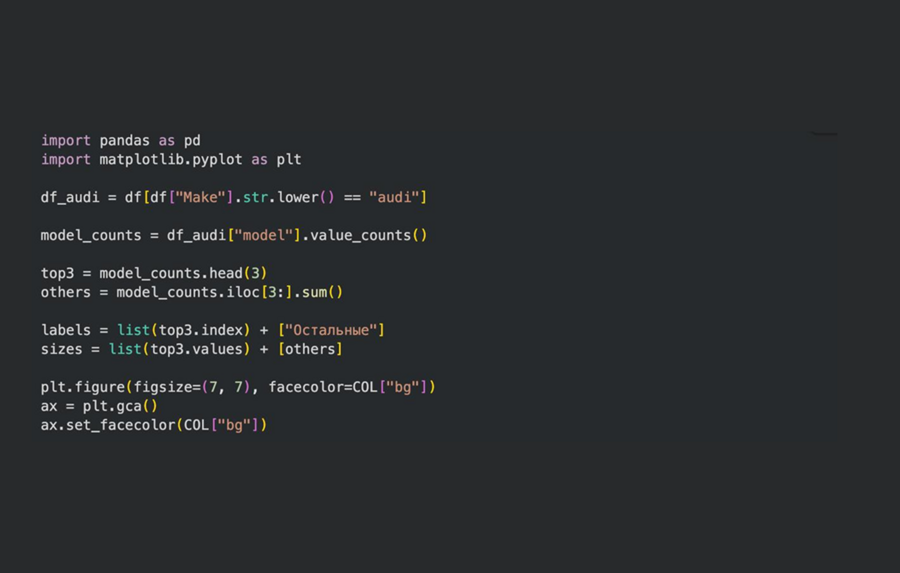 • Частотный анализ категориальных данных — использовался для определения наиболее популярных моделей автомобилей Audi. Агрегация и визуализация долей позволили сравнить вклад ключевых моделей относительно всех остальных.