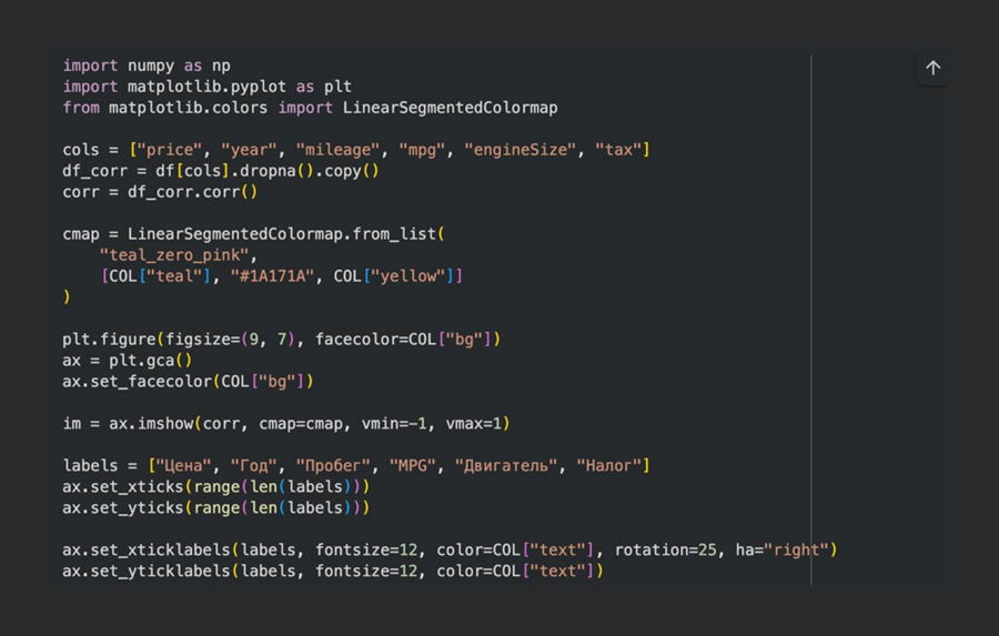 • Анализ взаимосвязей (корреляционный анализ) — применялся для оценки силы и направления связей между ценой и техническими характеристиками автомобиля (год выпуска, пробег, расход топлива, объём двигателя, налог). Коэффициенты корреляции позволили количественно оценить вклад каждого фактора.