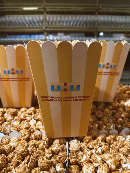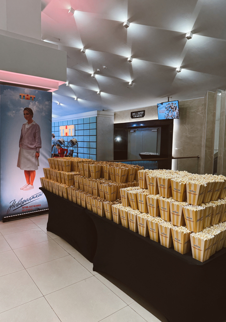Внутри гостей встречали крупные экранные стенды с персонажами, единообразная айдентика на афишах и программах, а также насыщенная welcome-зона с шампанским и ассорти попкорна.