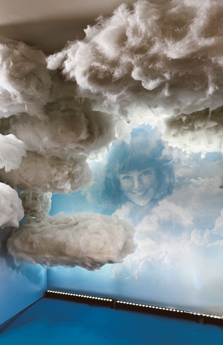 На первом этаже гостей ожидала ковровая дорожка, оформленная в единой палитре фильма — белой, голубой и синей, что обеспечивало визуальную целостность пространства.