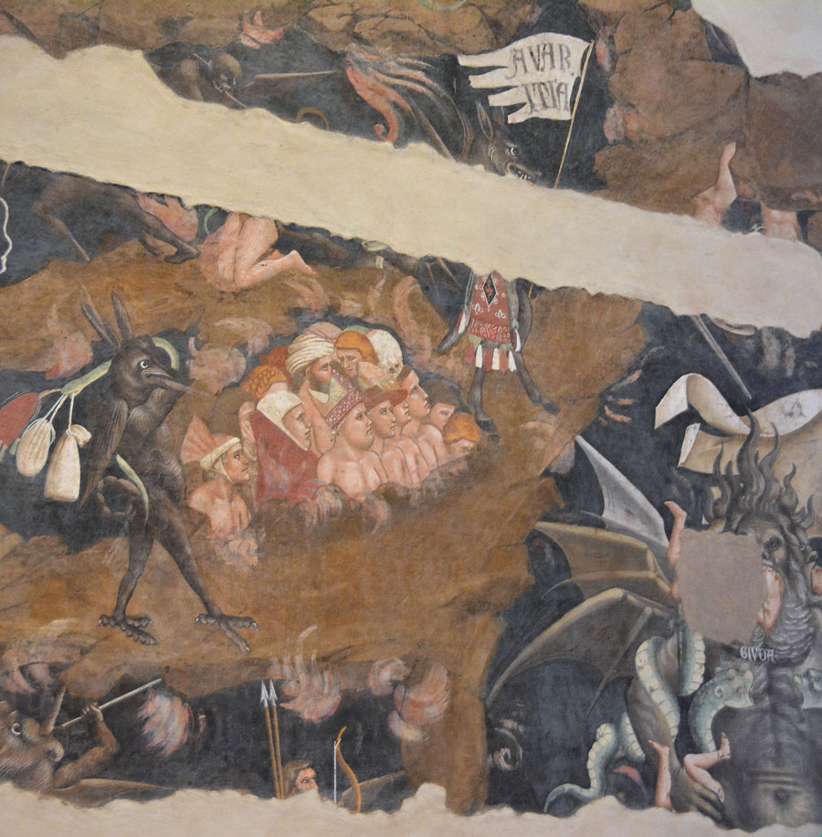Во фреске особенно выделяется натурализм страданий, а вместо порядка в композиции царит хаос, вызывающий ощущение тревоги. Доминирующие фигуры в работе — демоны и силы зла, изображение ада и кары приобретает наиболее сильное звучание.