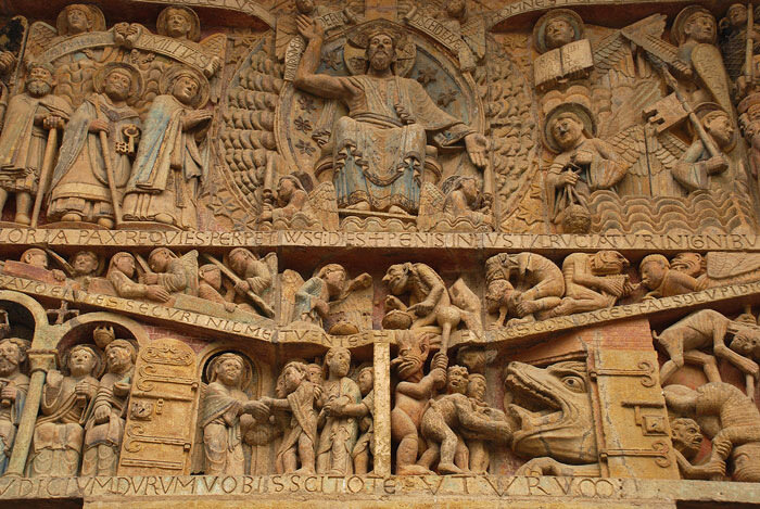 В тимпане «Страшный суд» в Аббатской церкви также присутствует сюжет «Христос во славе», только в отличие от, например, тимпана в Сен-Лазар, Христос в изображении предстает не просто строгим и отрешенным судьёй, а даже жестоким. Примерно половину тимпана занимают изображения страшных мук грешников.