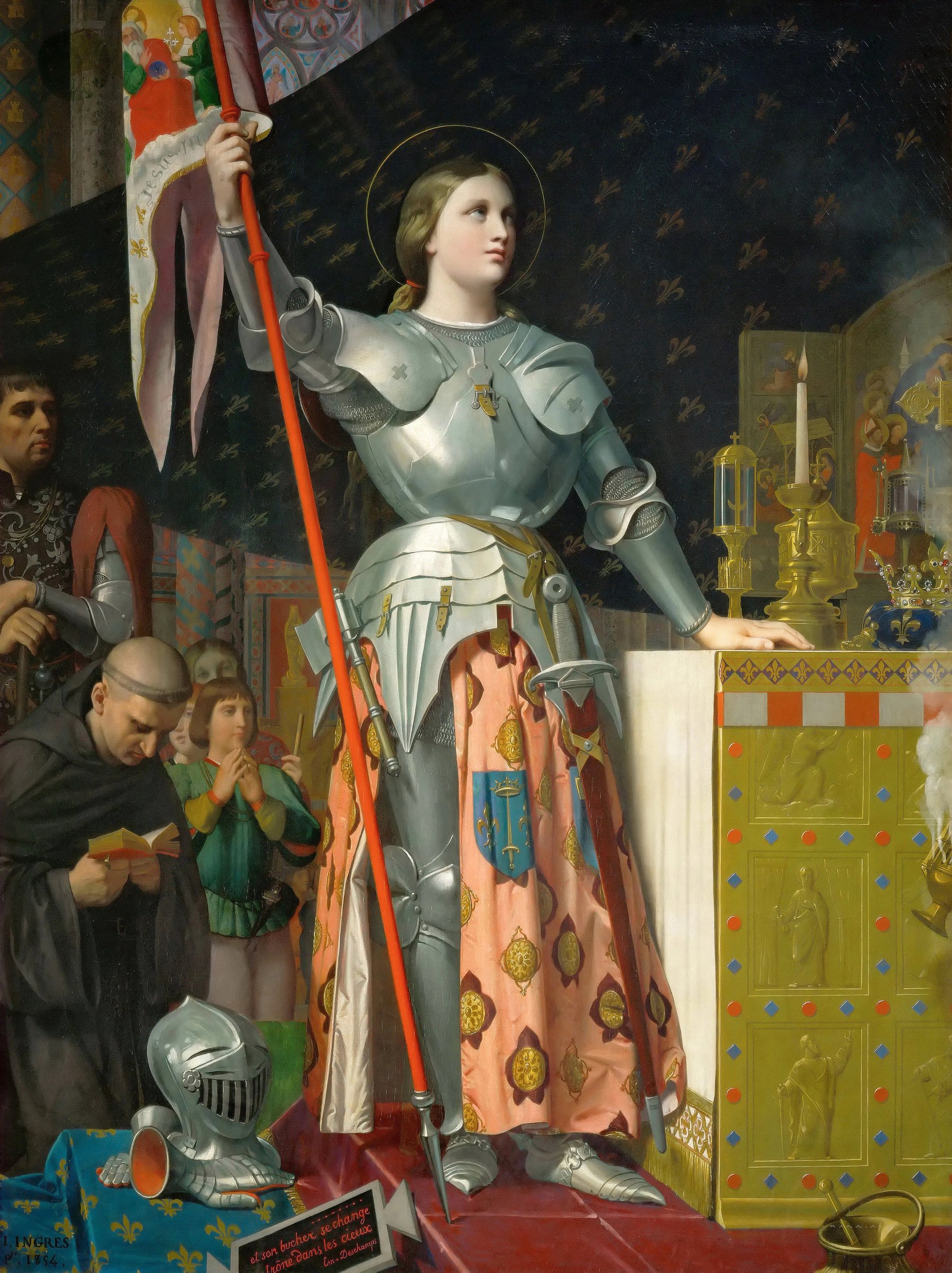 «Жанна д’Арк на коронации Карла VII» Жан-Огюста-Доминика Энгра (1854) представляет собой монументальное историческое полотно, запечатлевшее ключевой момент Столетней войны — триумфальное помазание на царство Карла VII в 1429 году в Реймском соборе, которое стало возможным во многом благодаря победам семнадцатилетней Орлеанской девы. Обращение художника к этому сюжету было неслучайным для середины XIX века, периода, когда Жанна д’Арк начала приобретать статус культовой фигуры народного патриотизма. Художник одним из первых изобразил её с святым нимбом, предвосхитив её официальную канонизацию, состоявшуюся лишь спустя 70 лет.