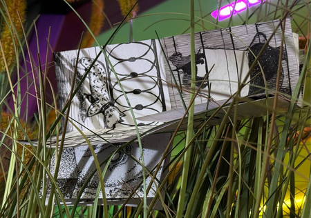 Авторские фотографии становятся фоном, на который вписаны графические силуэты животных, движущихся к символу спасения.