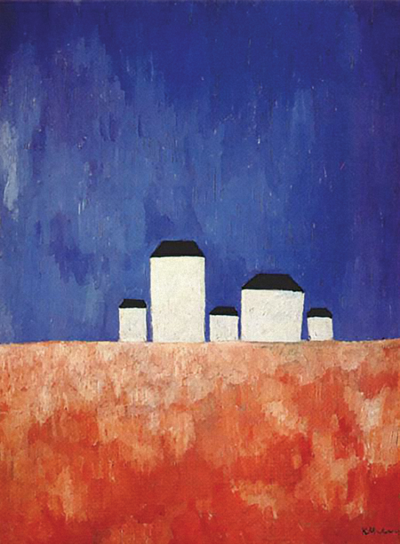 Тимур Новиков, «Чемпион по прыжкам в воду», 1988 / Казимир Малевич , «Пейзаж с пятью домами», 1932
